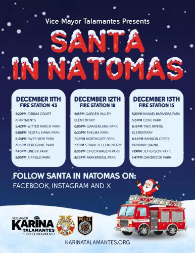 Santa is loading up the firetruck for three evenings of holiday fun across Natomas! Check the schedule to find your closest stop.