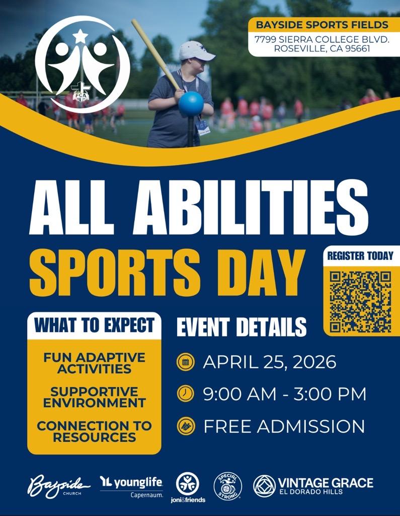 The Fellowship of Christian Athletes are hosting an All-Abilities Sports Day on Saturday, April 25, 2026, from 9:00 am – 3:00 pm. The event is free but participants must be least 11 years old at the time of the event. Registration is required.