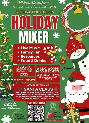 Join Sacramento City Unified School District Community Advisory Committee for Special Education for a Holiday Mixer on Tuesday, December 16 from 5:30 pm – 7:30 pm. Enjoy live music, resources, and food!